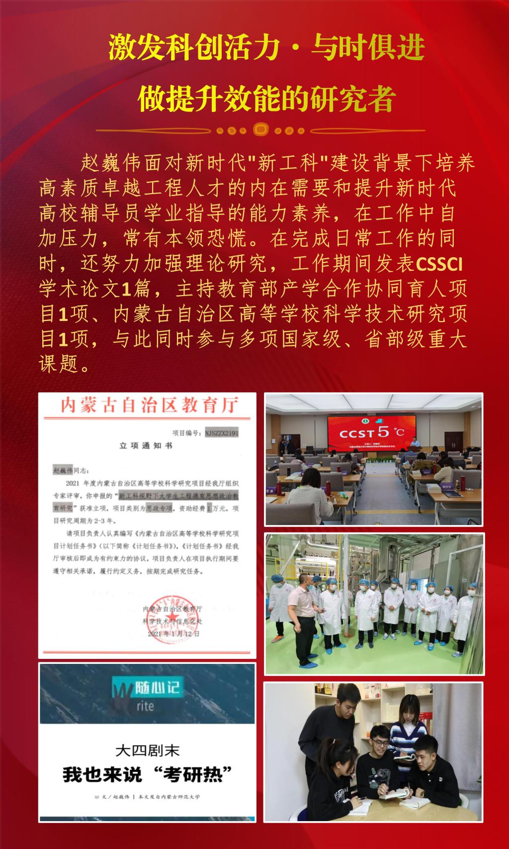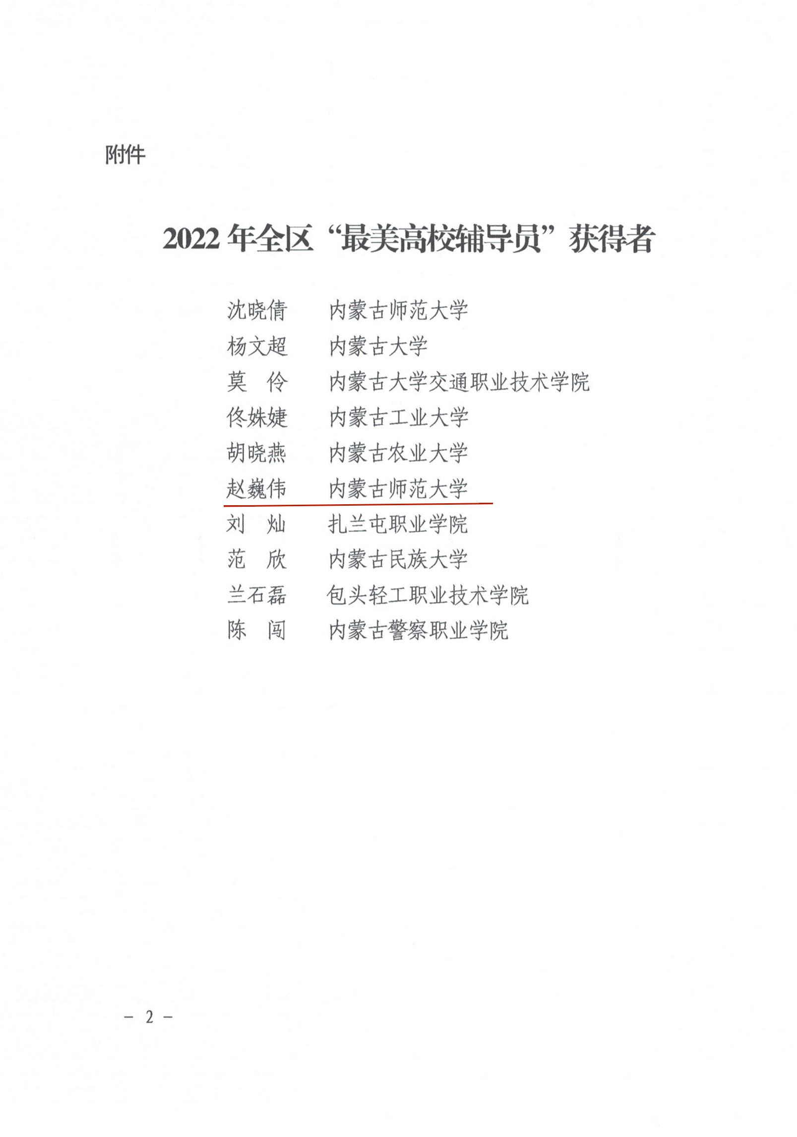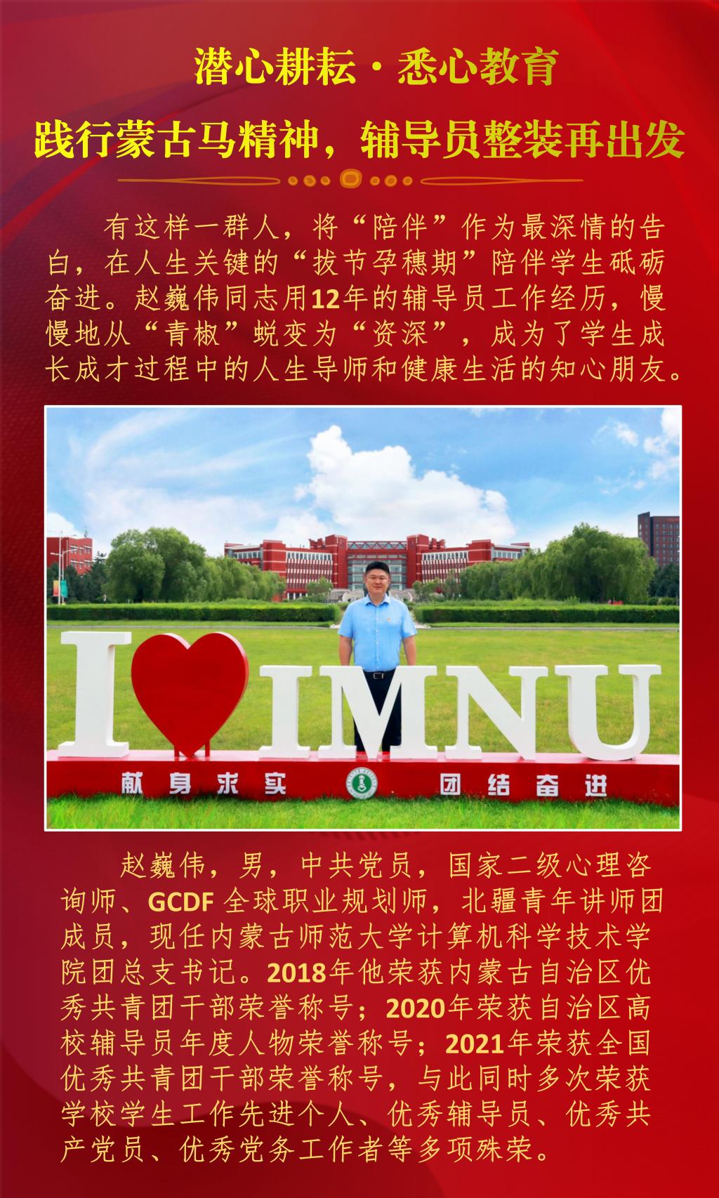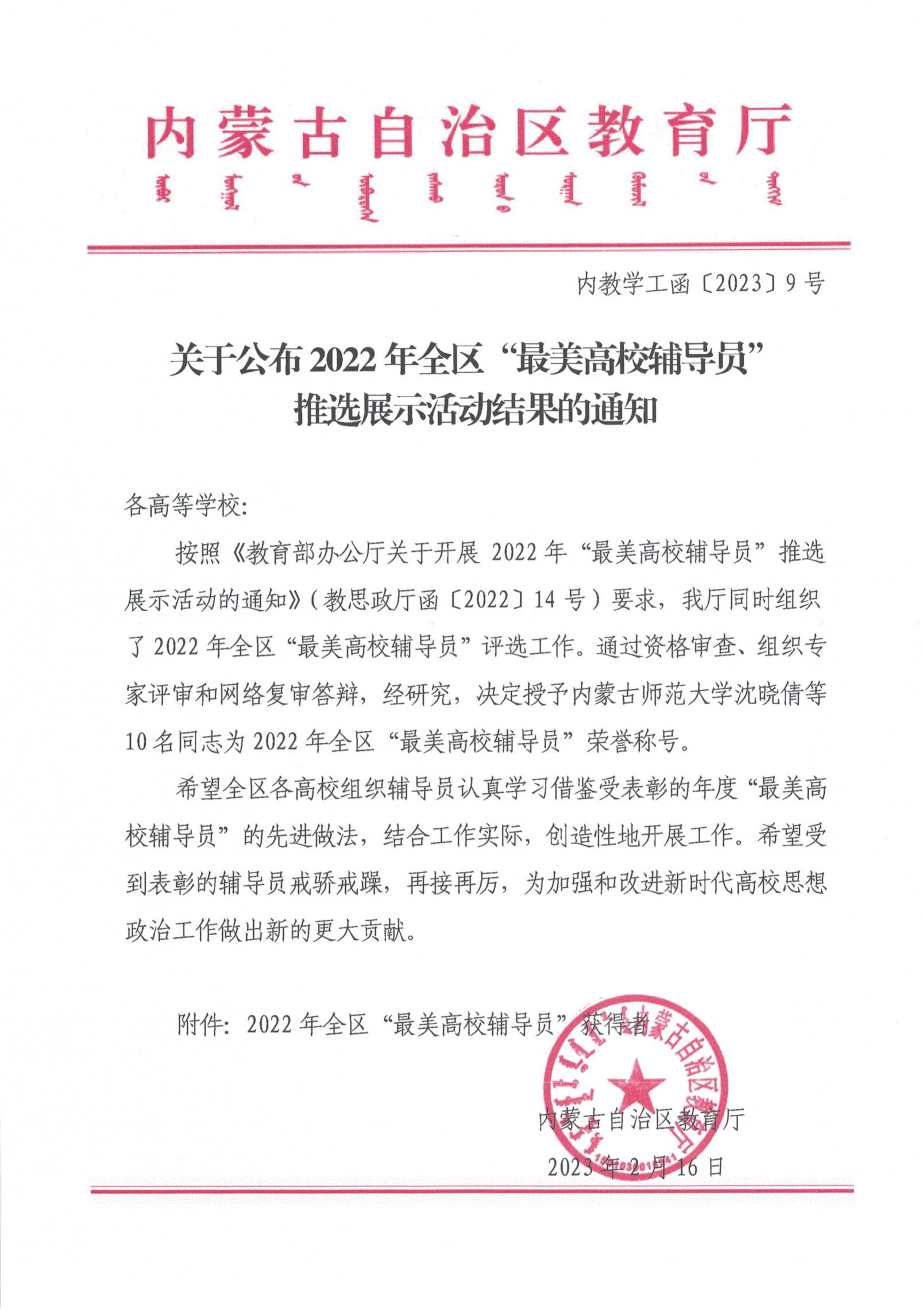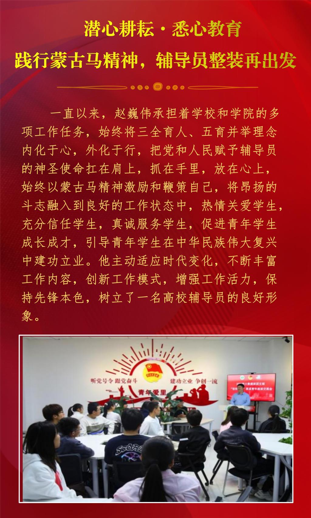 近日,内蒙古自治区教育厅公布了2022年全区最美高校辅导员推选展示活动的结果,经过资格审查、组织专家评审和网络复审答辩,授予10名辅导员“2022年全区最美高校辅导员荣誉称号”。beat365官网辅导员赵巍伟获此项荣誉。