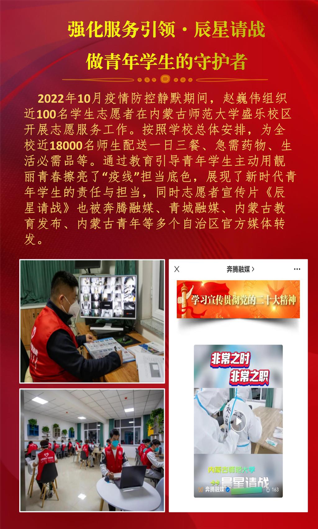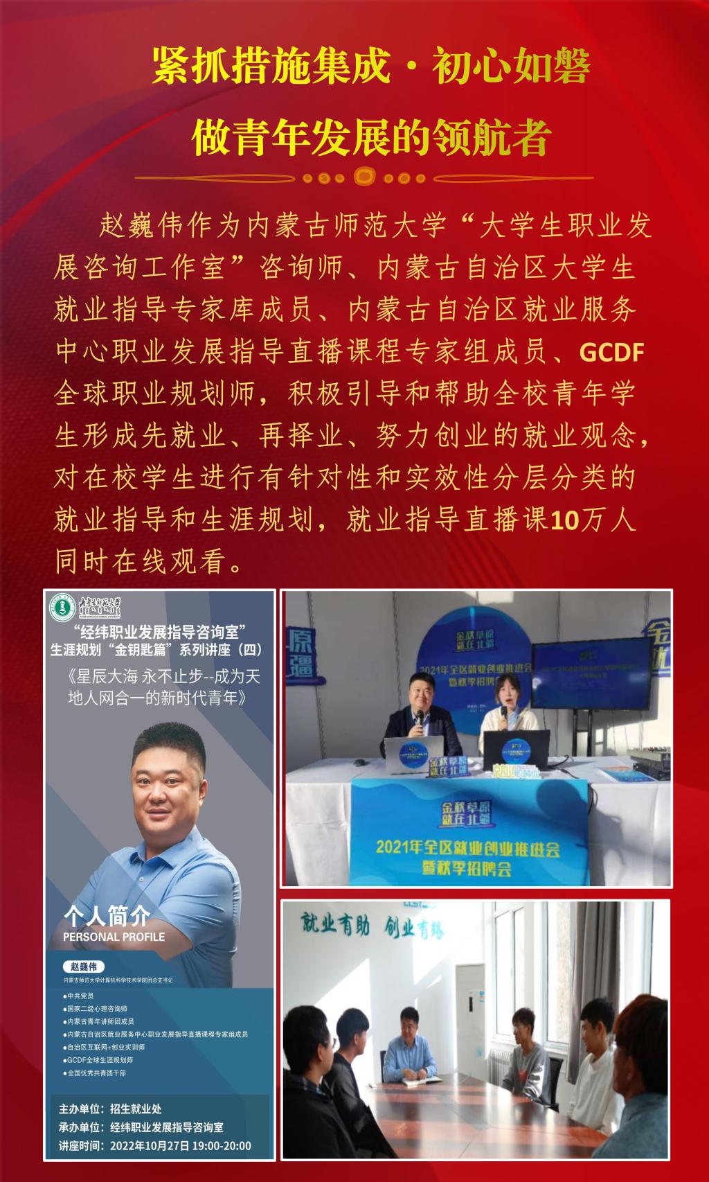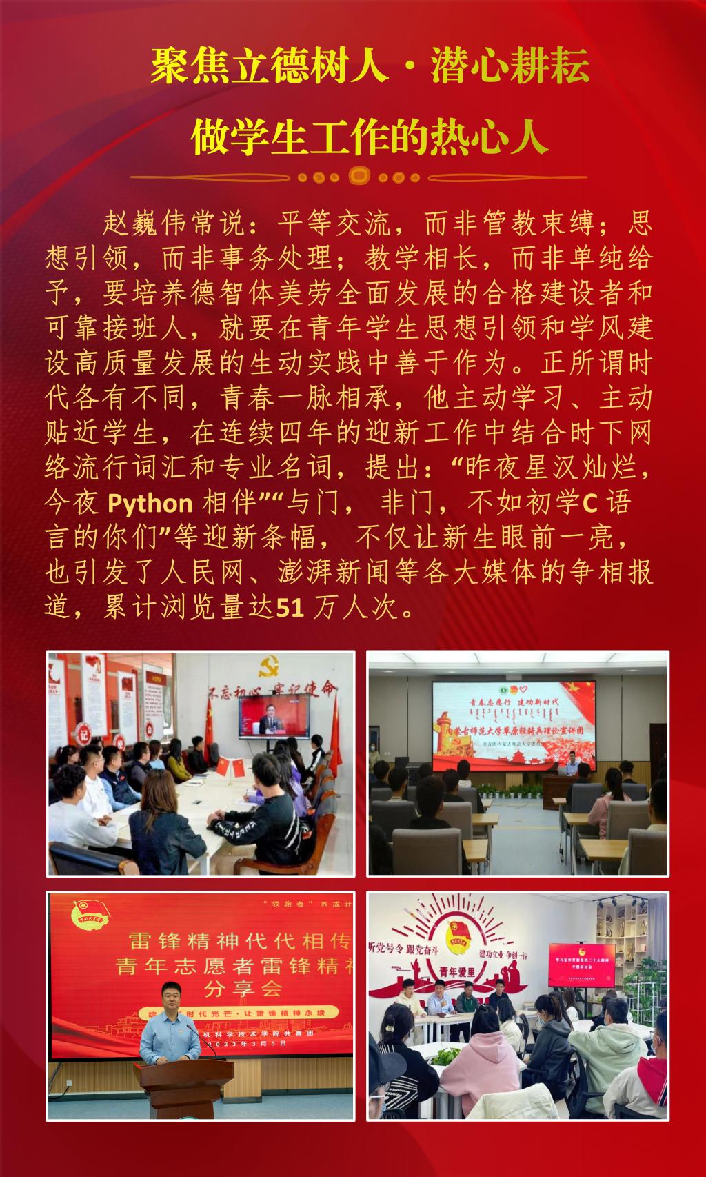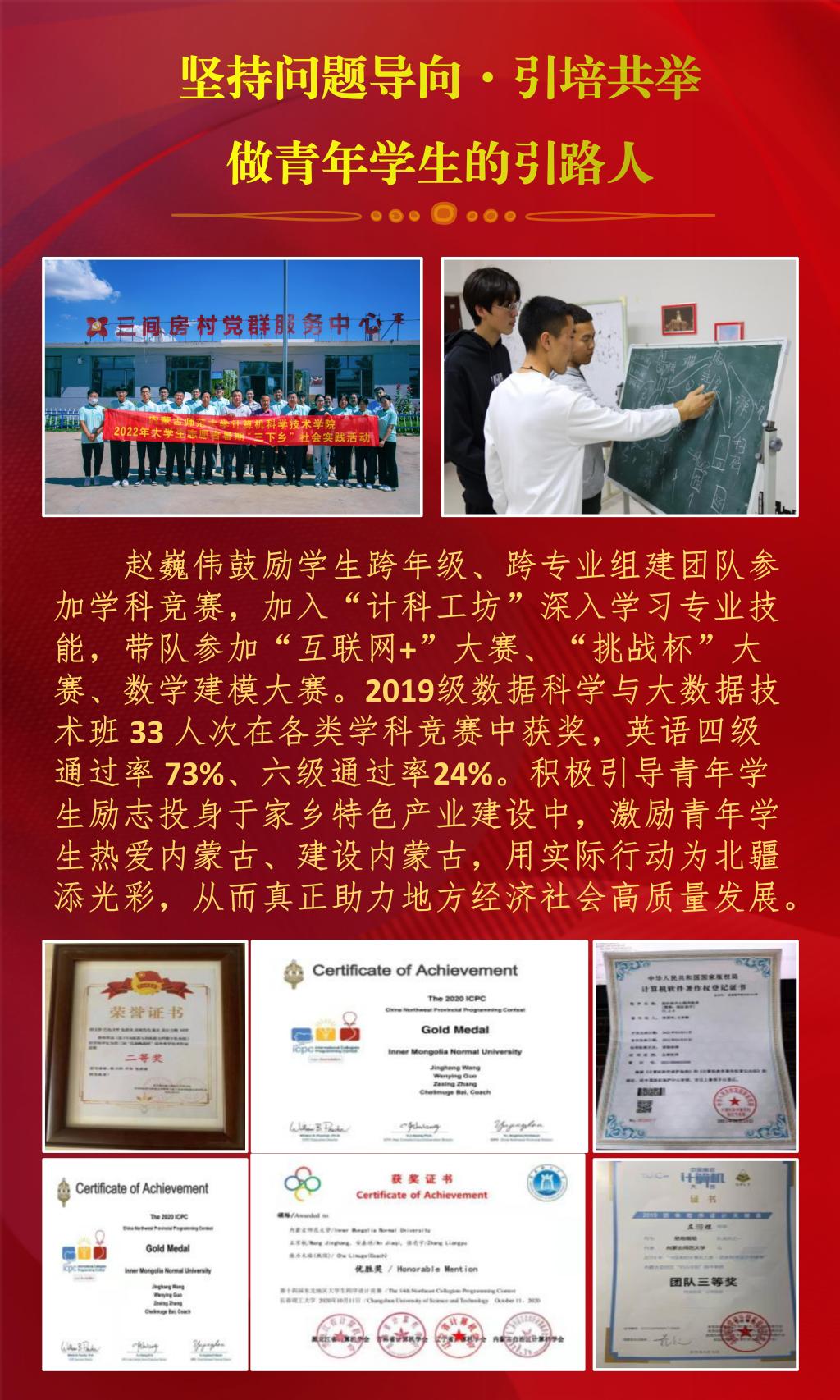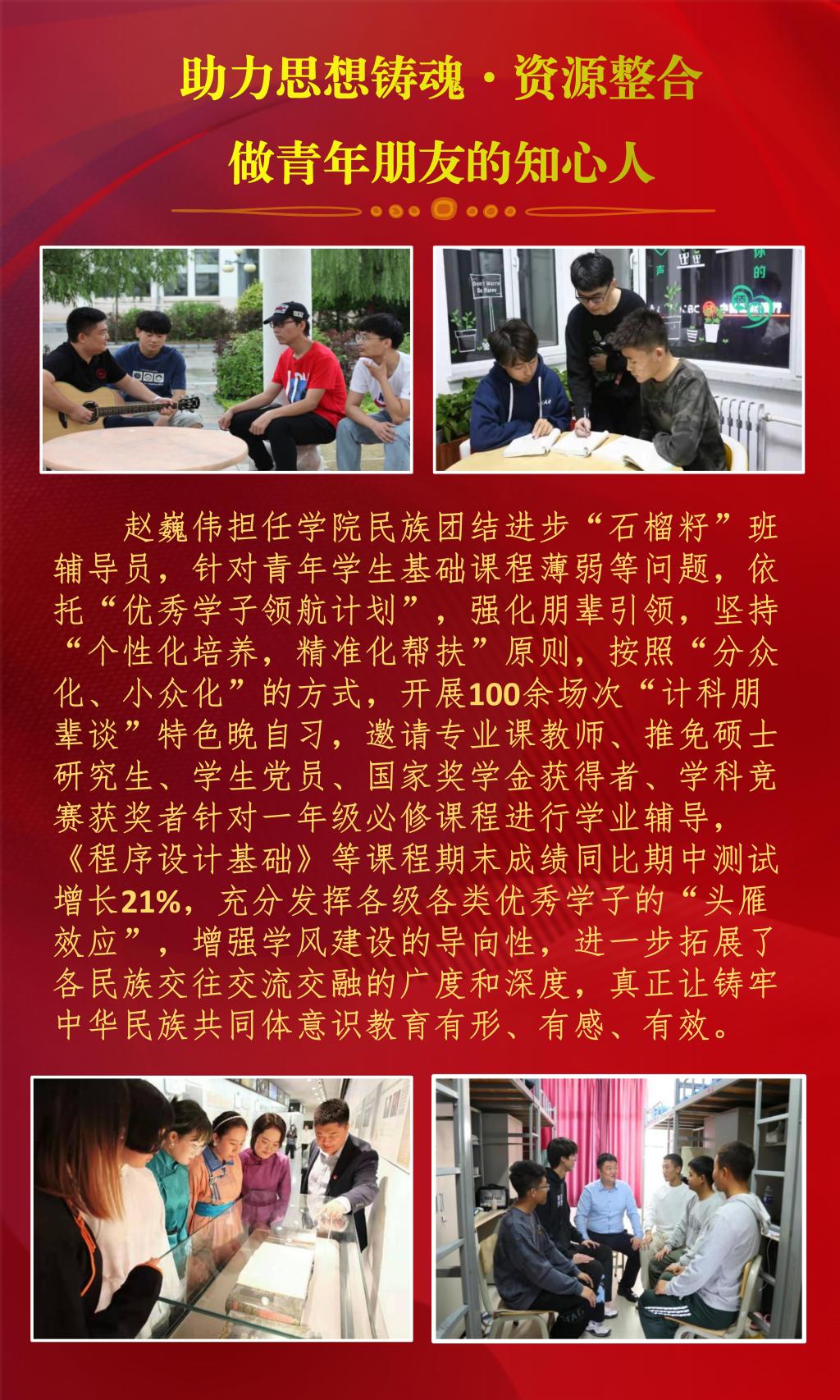 近日,内蒙古自治区教育厅公布了2022年全区最美高校辅导员推选展示活动的结果,经过资格审查、组织专家评审和网络复审答辩,授予10名辅导员“2022年全区最美高校辅导员荣誉称号”。beat365官网辅导员赵巍伟获此项荣誉。