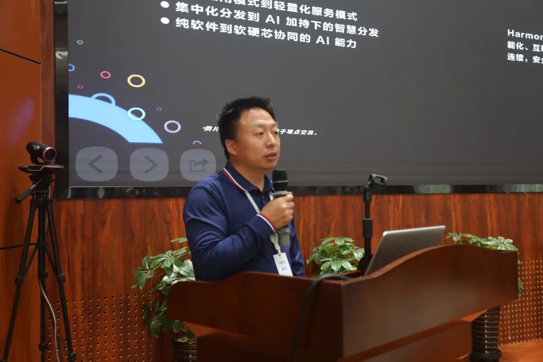 诚迈科技(南京)股份有限公司鸿蒙事业部技术总监吴永鹏就行业背景分析、人才缺口现状、教育与产业对接、未来人才培养策略、行业机遇与挑战等几个方面进行主题为《鸿蒙产业发展及产教融合》的分享。他指出,HarmonyOS已具备一定规模,未来国产操作系统会在推动产业升级方向上至关重要,人才缺口却始终巨大,希望与高校通过产教融合,共同开发鸿蒙人才培养课程,为学生提供实践机会,帮助他们快速融入产业。