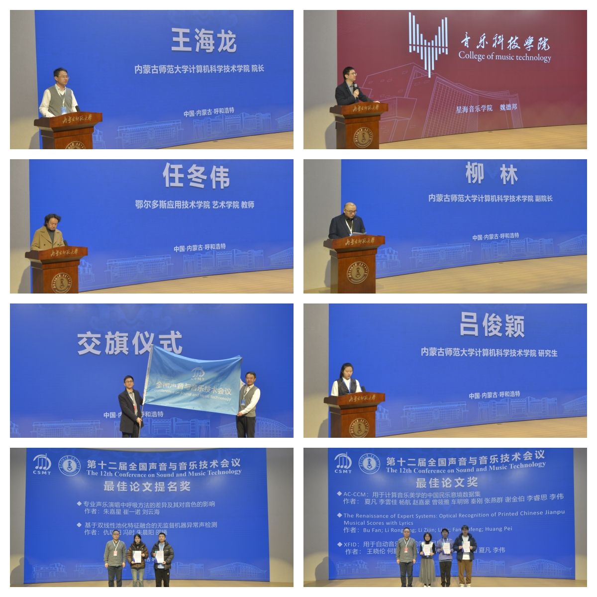 11月9日中午,大会举行闭幕式。会议执行主席王海龙教授首先作大会总结报告,全面回顾了本届会议取得的丰硕成果。在随后的交流环节,鄂尔多斯应用技术学院任冬伟副教授分享了参会心得,beat365英国官网网站吕俊颖同学代表全体参会学生发言。闭幕式上举行了隆重的颁奖典礼,颁发了"最佳论文奖"和"最佳论文提名奖",并对大会志愿者团队进行了表彰。在庄严的会旗交接仪式中,本届承办方beat365英国官网网站正式将会议会旗移交下一届承办方星海音乐学院。星海音乐学院魏德邦副院长代表下届承办方发表致辞,诚挚邀请全国学界同仁2026年相聚广州,继续推动我国声音与音乐技术领域的发展。闭幕式由beat365英国官网网站副院长柳林主持。