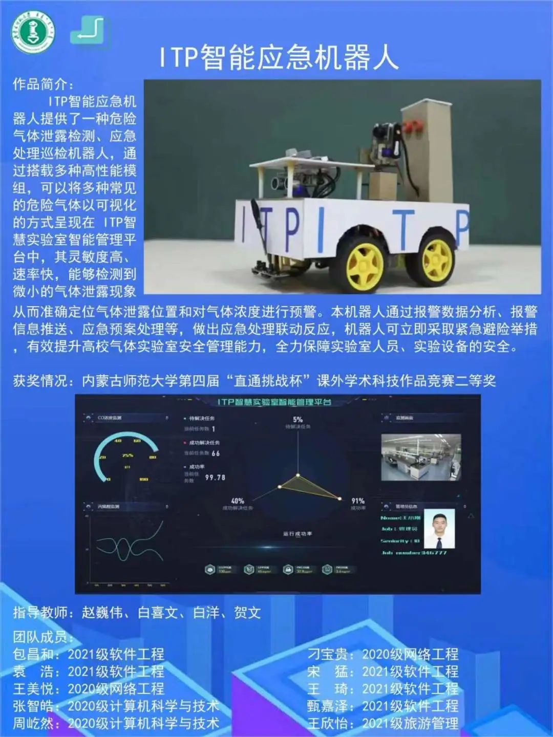 工坊的建设与发展充分面向和围绕“卓越工程师”教育培养计划,立足于培养创新能力强、适应经济社会发展需要的高质量信息技术人才。截止2023年9月,工坊累计完成实践化项目100余项,获得国内外科技比赛奖项300余项。以近三年为例:“AI管理员-基于AI识别的智能管理箱”2021年荣获第七届中国国际“互联网+”大学生创新创业大赛国际级铜奖;2022年在团队程序设计天梯赛自治区团队二等奖;“有价值-基于AI人岗匹配的数智化校招服务平台”2022年荣获第八届中国国际“互联网+”大学生创新创业大赛国际级铜奖;“智创编程-青少年编程教育引领者”2022年荣获第三届全国师范生微课大赛全国二等奖;“批量液体样本信息采集机器人系统设计与实现”荣获华北五省计算机大赛二等奖;“数字孪生-探索数字化世界的先行者”取得1项计算机软件著作权。2023ACM-ICPC丝绸之路国际大学生程序设计竞赛(中国邀请赛)银奖;2023年RAIIEC战队在“第二十二届全国大学生机器人大赛RoboMaster2023机甲大师高校联盟赛(西北站)”3V3对抗赛(非甲级战队)中荣获三等奖、步兵对抗赛(非甲级战队)中荣获三等奖等多项国家级、自治区级奖项。
