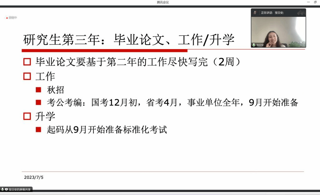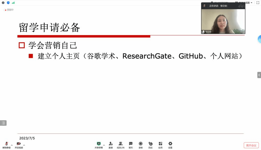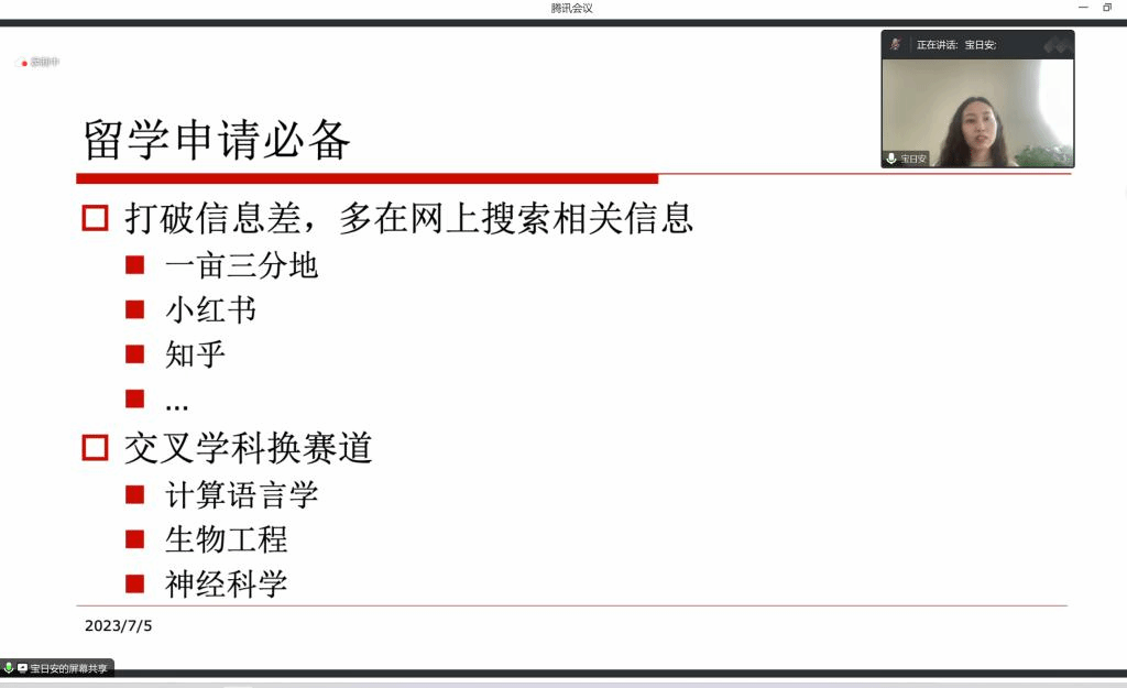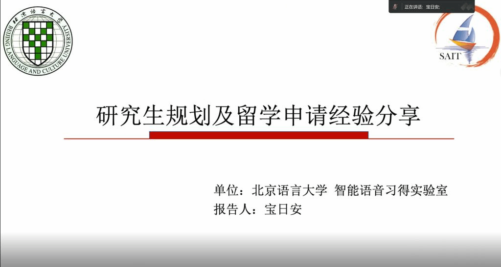 为指导beat365英国官网网站在读研究生了解留学申请的流程,帮助学生高效利用在校的三年时间,2023年7月5日下午,学院白双成老师邀请北京语言大学语言智能与技术专业的毕业生宝日安开展了“研究生规划及留学申请经验分享”线上主题讲座,学院部分研究生和本科生积极参与。
