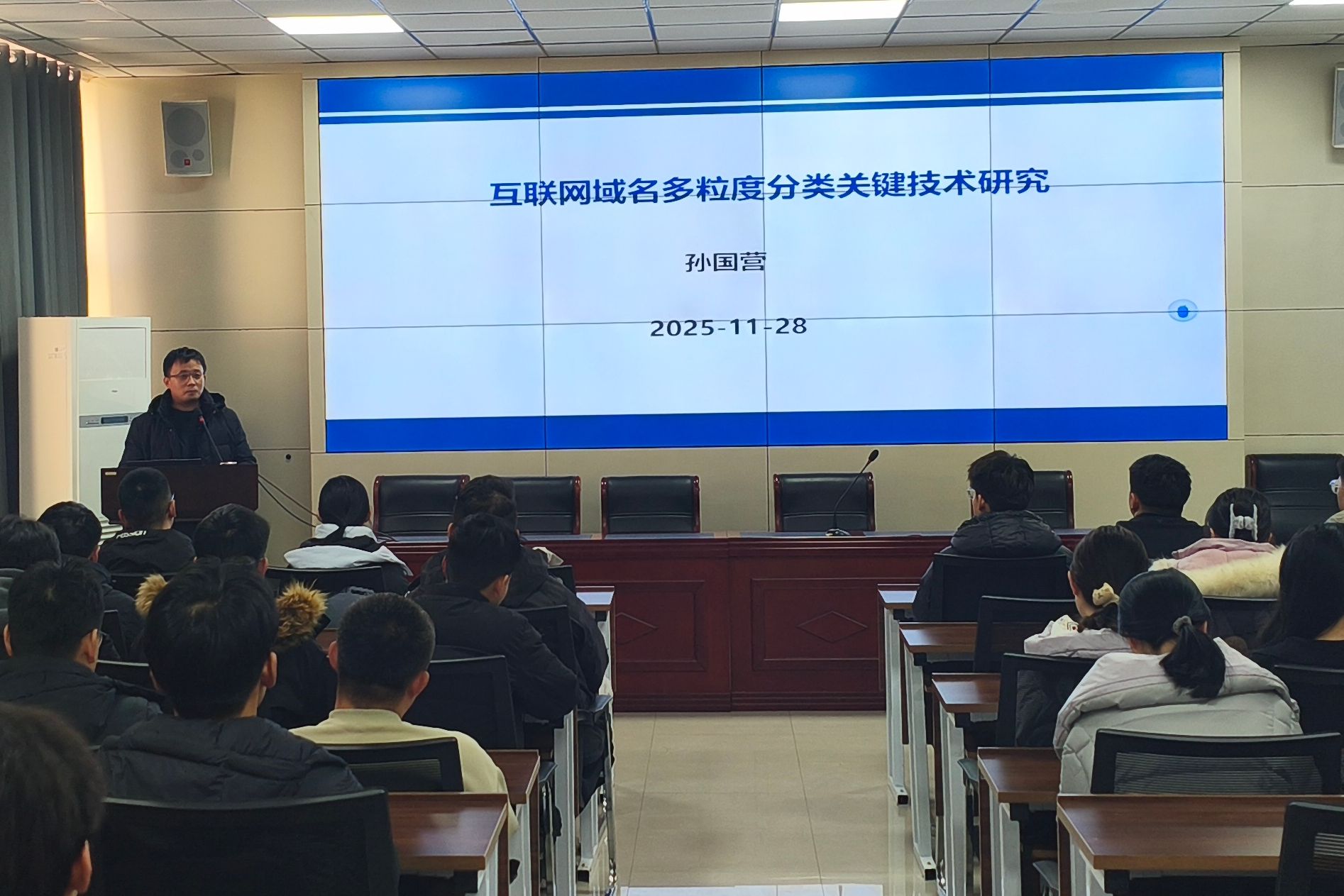 在题为《互联网域名多粒度分类关键技术研究》的专题讲座中,孙国营老师从互联网安全与管理的实际需求切入,系统阐释了域名系统在网络安全体系中的关键作用。基于其在网络空间安全领域的深厚研究积淀,他深入剖析了互联网域名多粒度分类的技术路线、研究方法与前沿进展,并就该领域面临的技术挑战与发展趋势分享了独到见解。